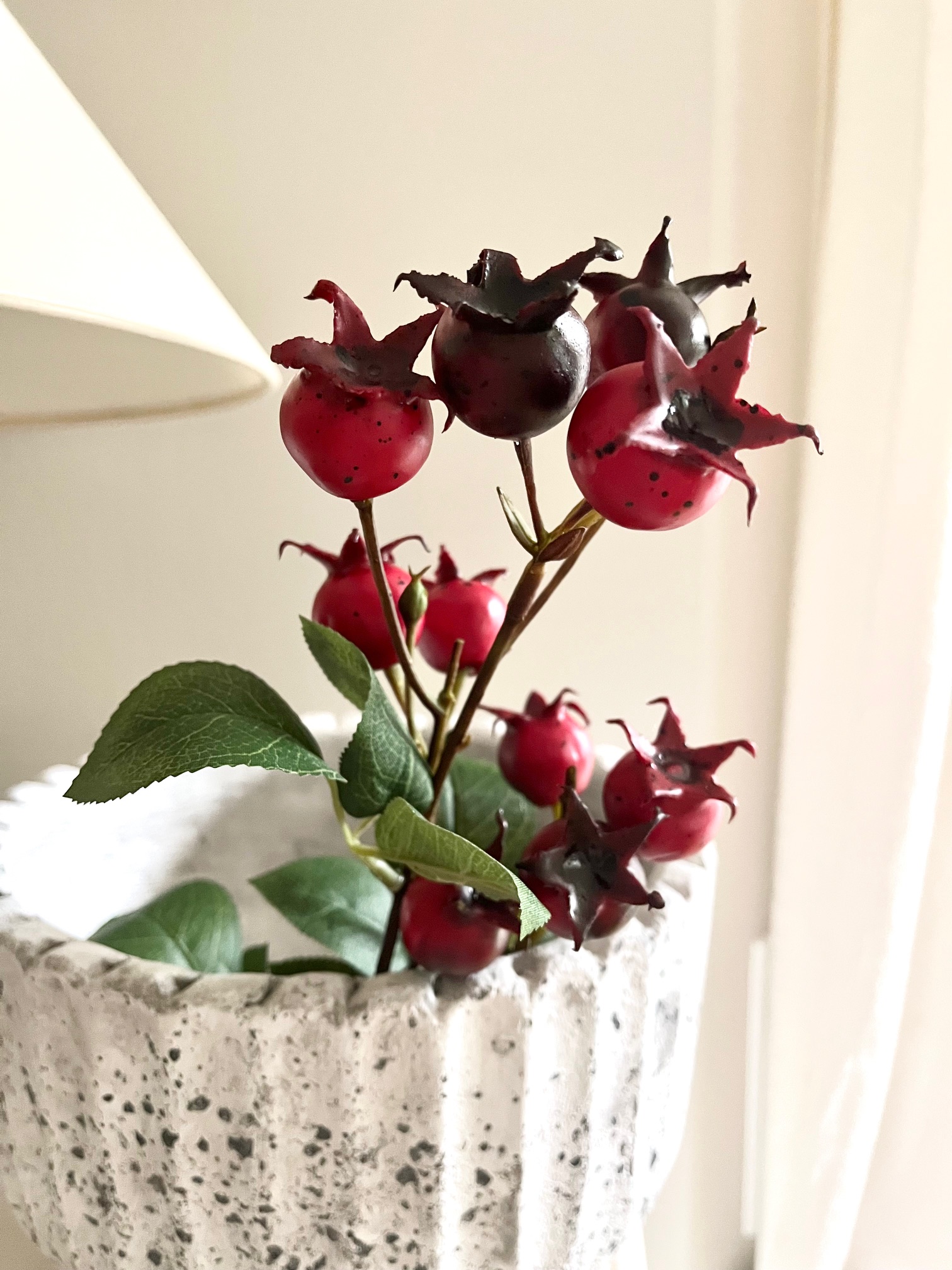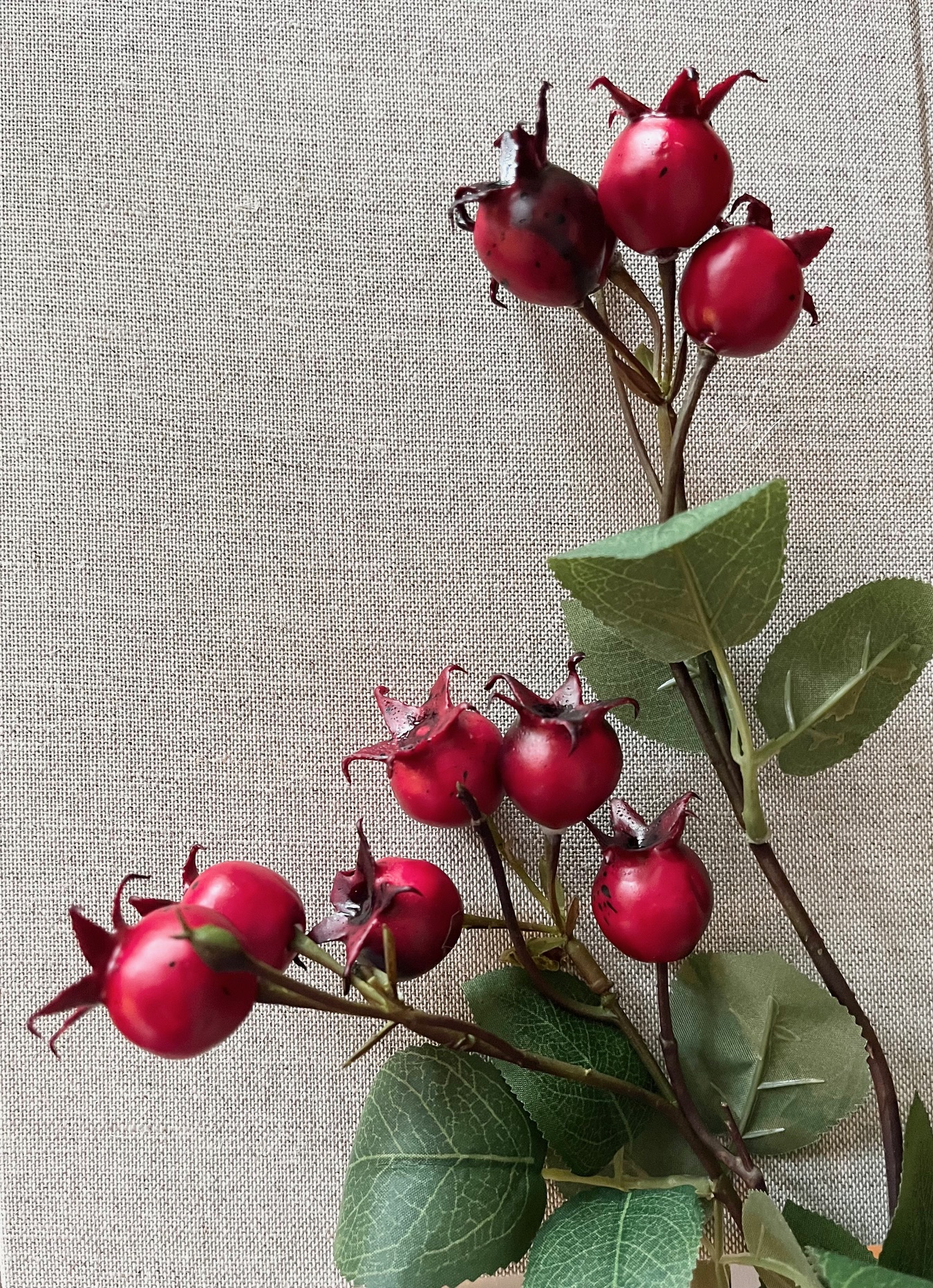 Schöner Hagebuttenzweig mit roten Früchten. Der Hagebuttenstiel ist verzweigt und verfügt über mehrere Hagebuttenfrüchte. Die Hagebutte kann schön dekoriert werden oder zum Sträuße binden und Herbstgestecke verwendet werden. Mit viel Liebe zum Detail gefertigt, sehen die Blüten täuschend echt aus.