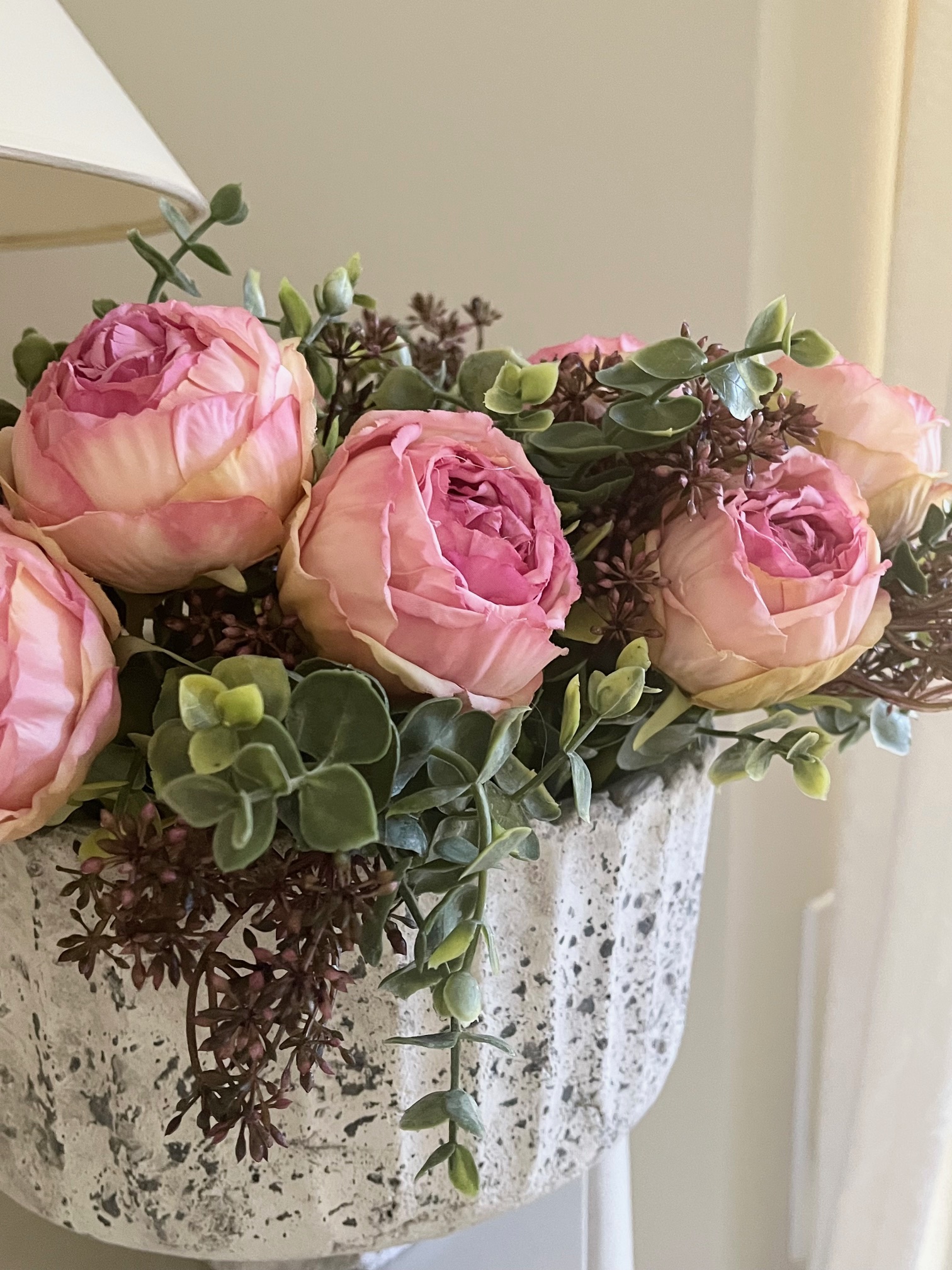 Dieser wunderschöne Kunstblumenstrauß wurde aus künstlichen Rosen und Beiwerk in der schönen Farbe Rosa gestaltet. Mit viel Liebe zum Detail gefertigt, sehen die Blüten täuschend echt aus.